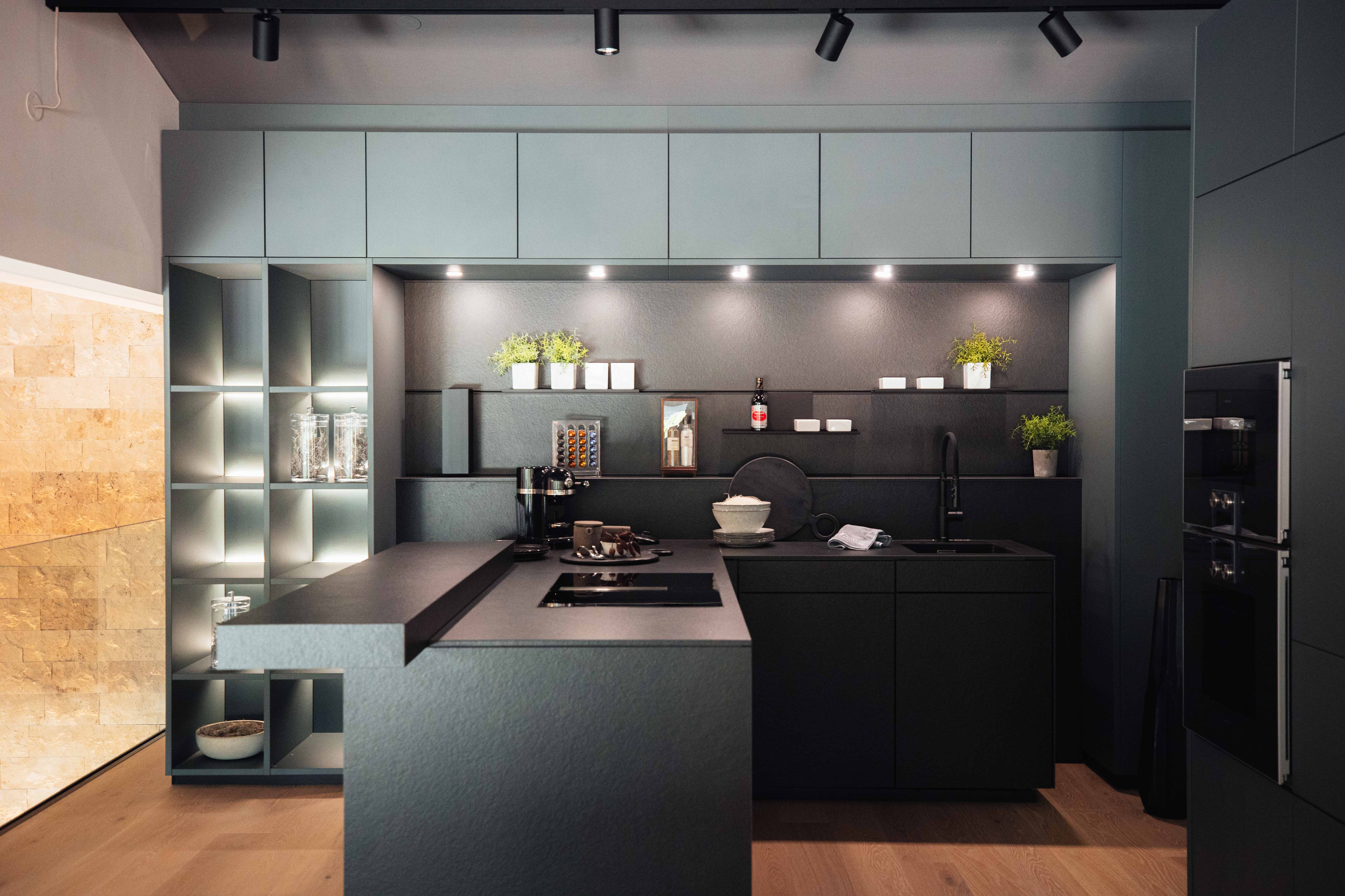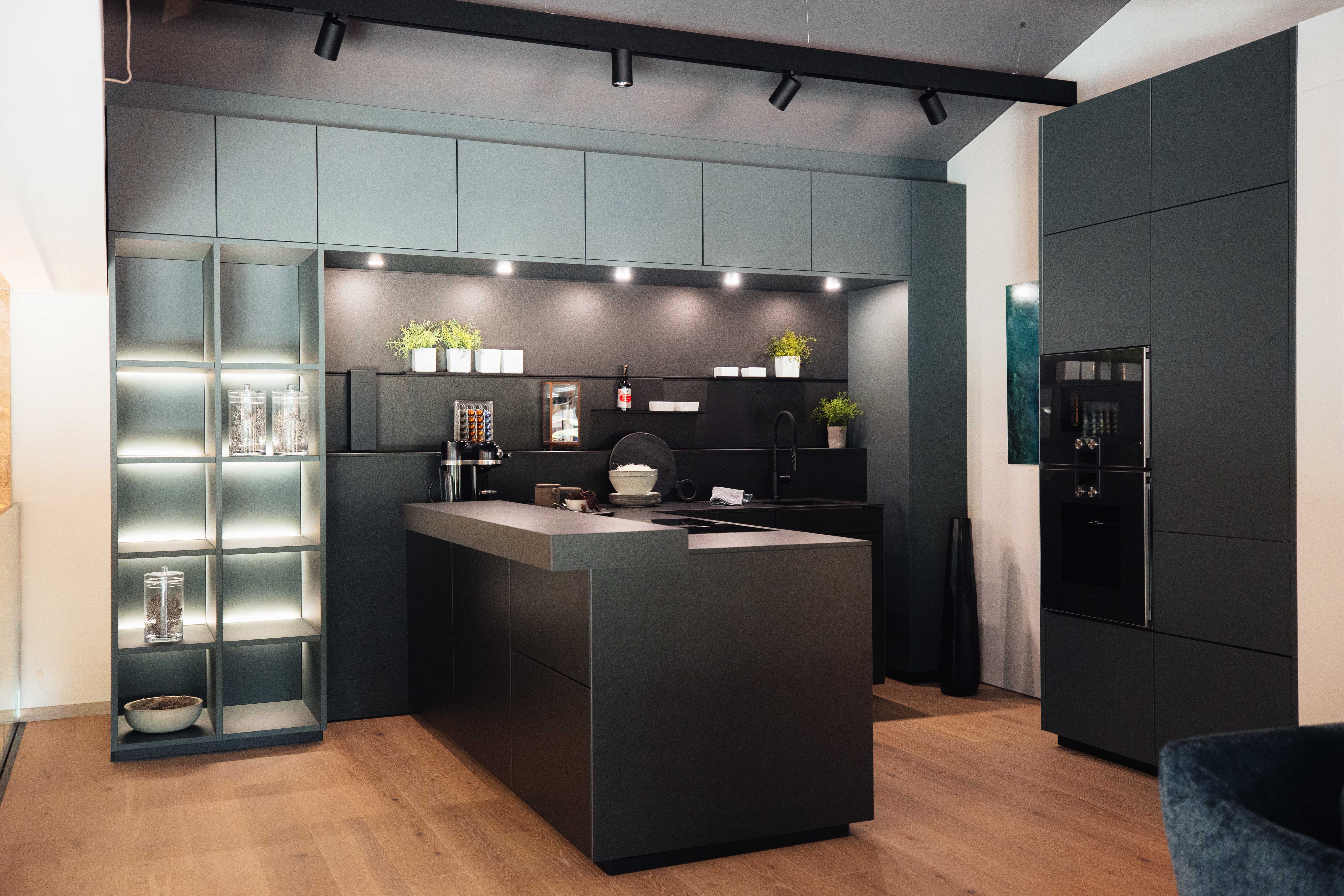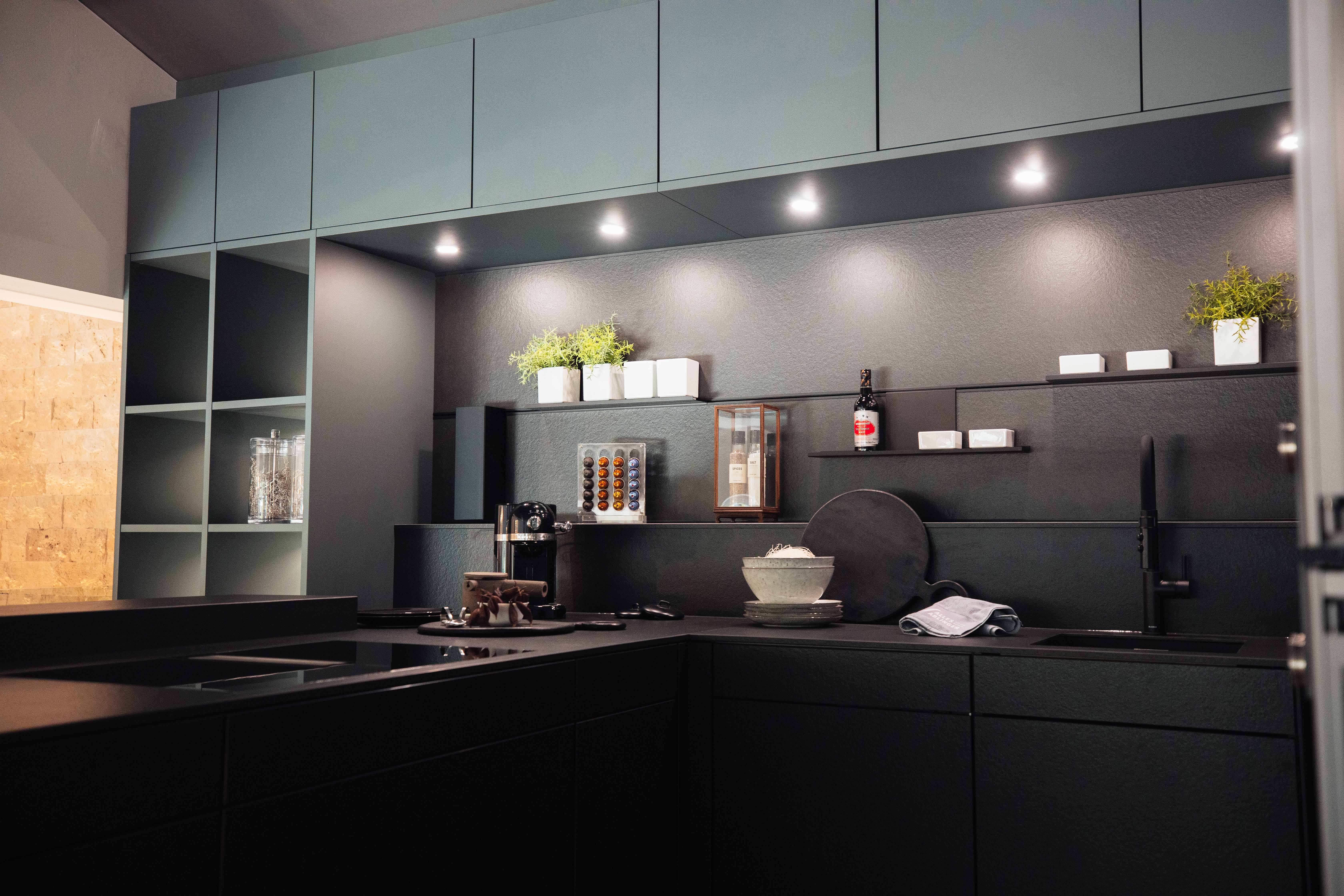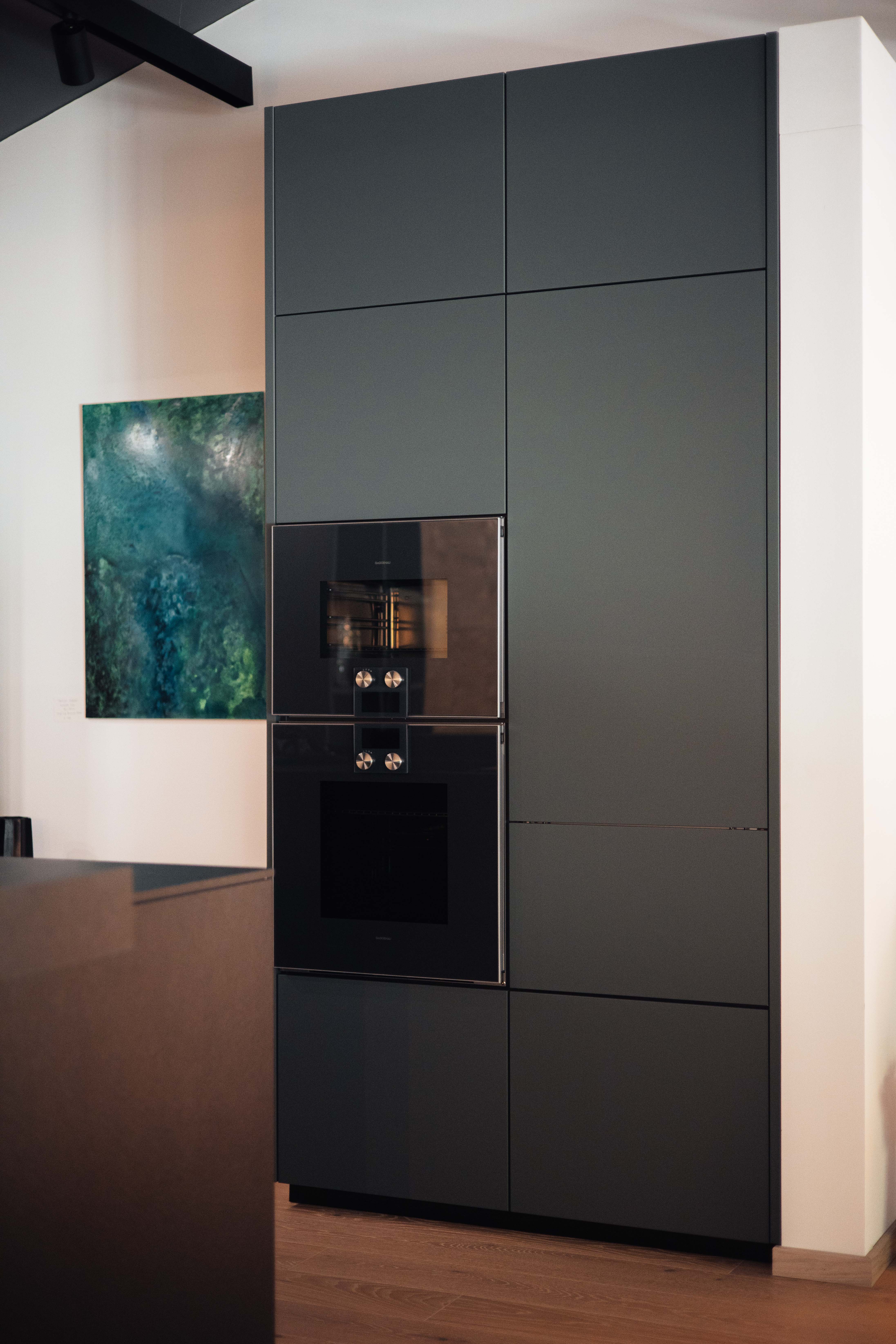 - Hoch- & Oberschränke in Kobaltgrün samtmatt mit Anti-Fingerprint-Beschichtung