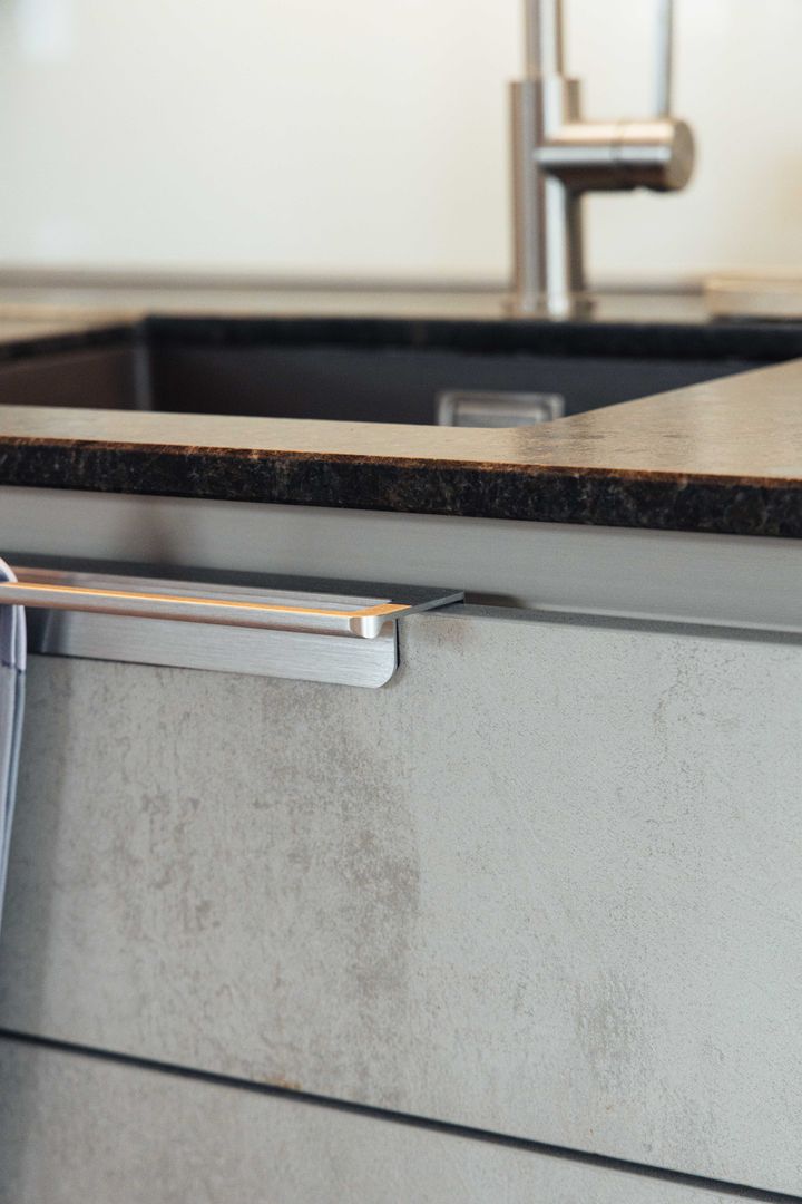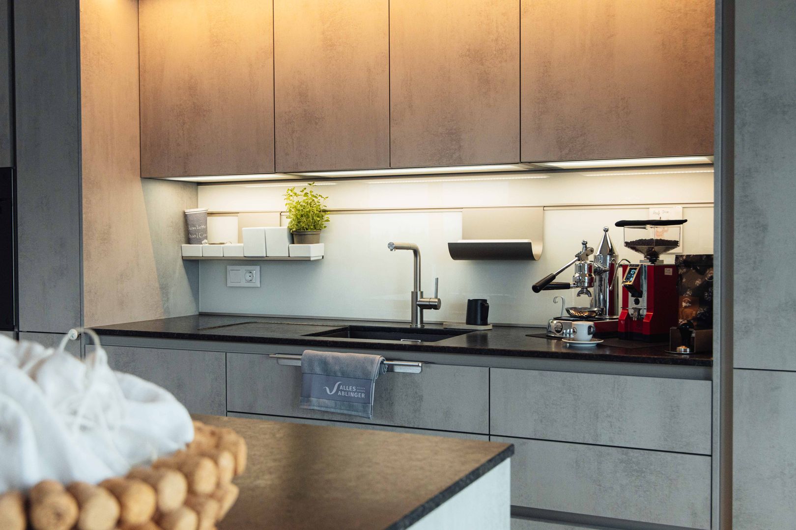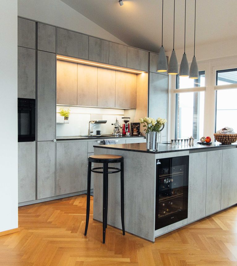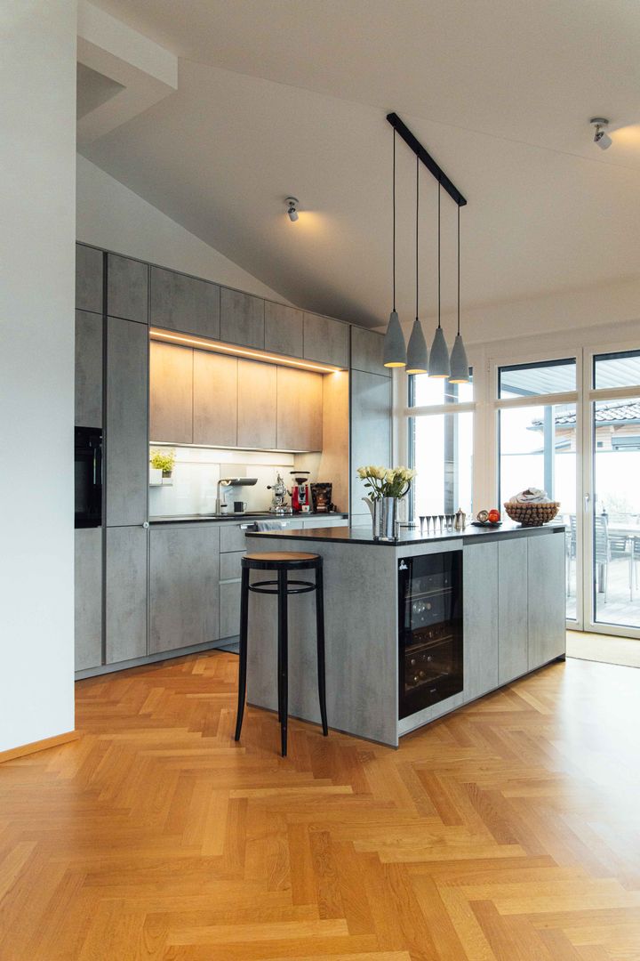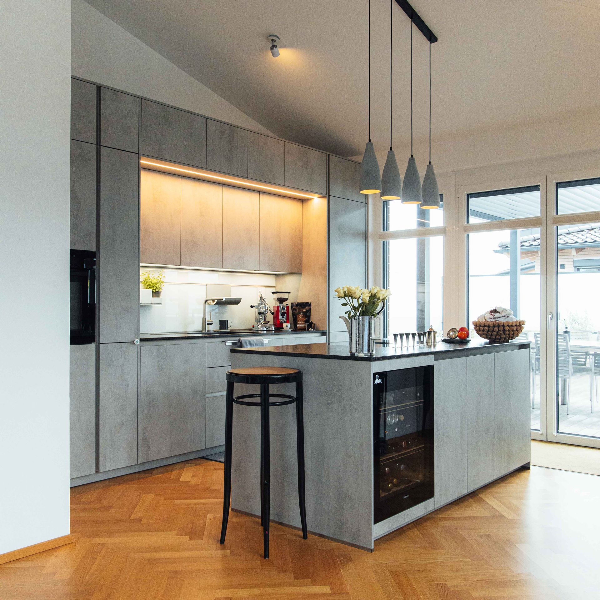 Diese zeitlose und funktionale Küche von Schüller Küchen in Beton-Quarzgrau mit weißer Glasrückwand und Eselstahl-Griffleisten haben wir für eine Kundin in Mondsee realisiert.