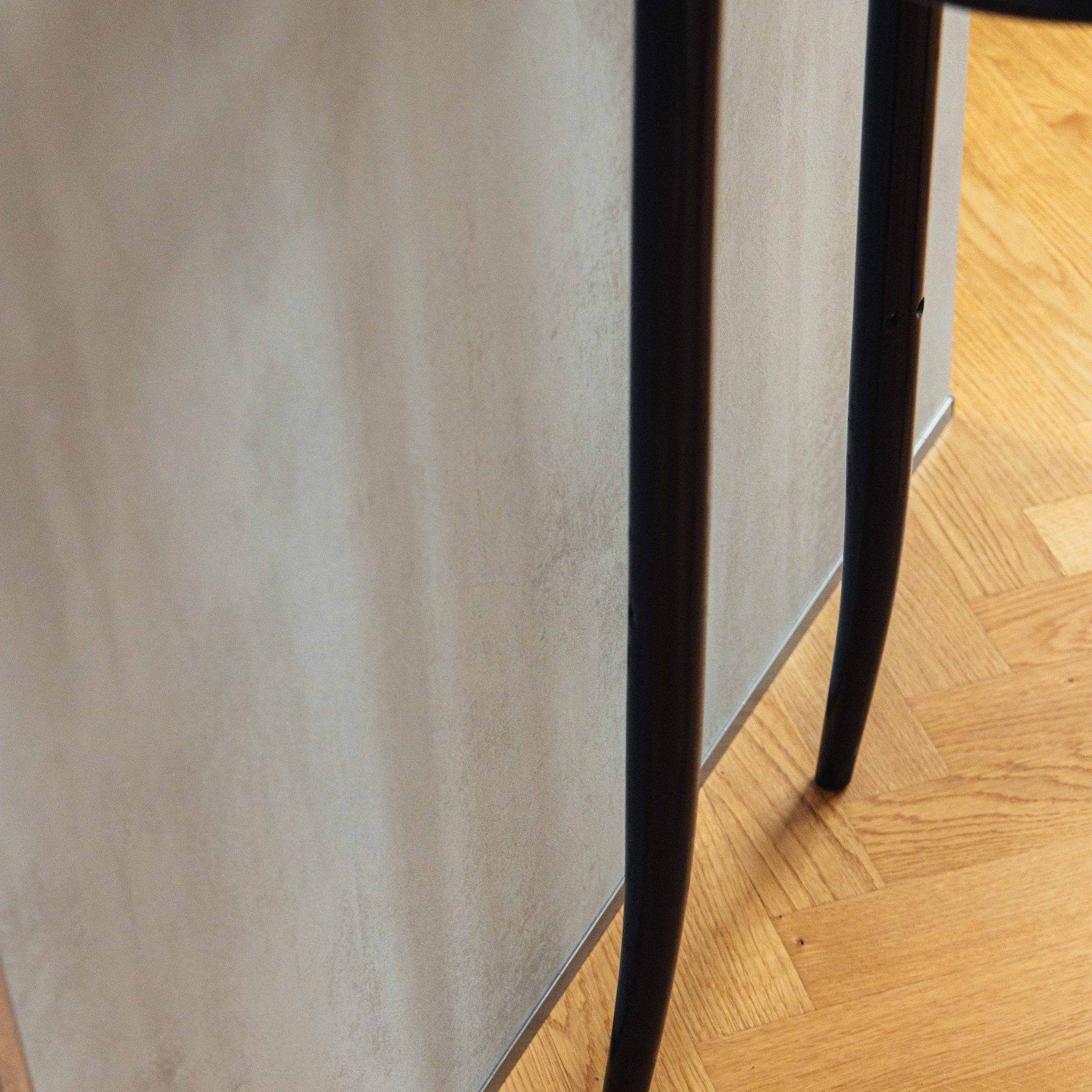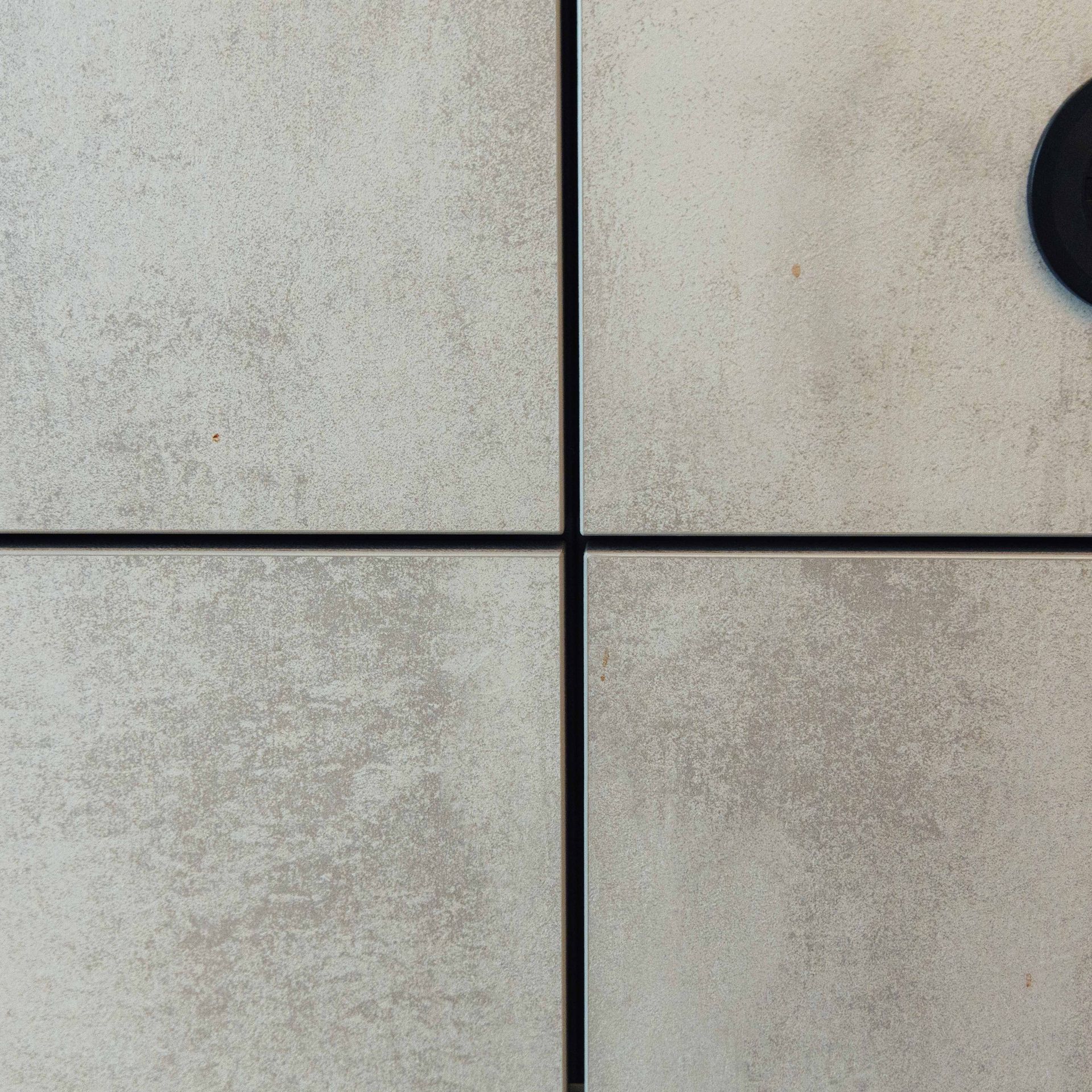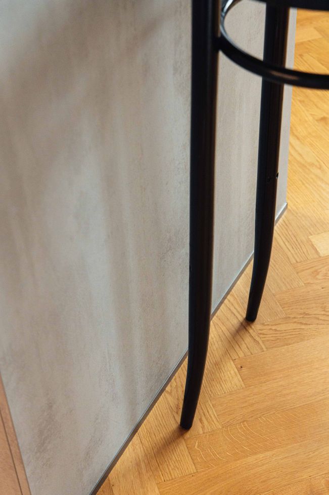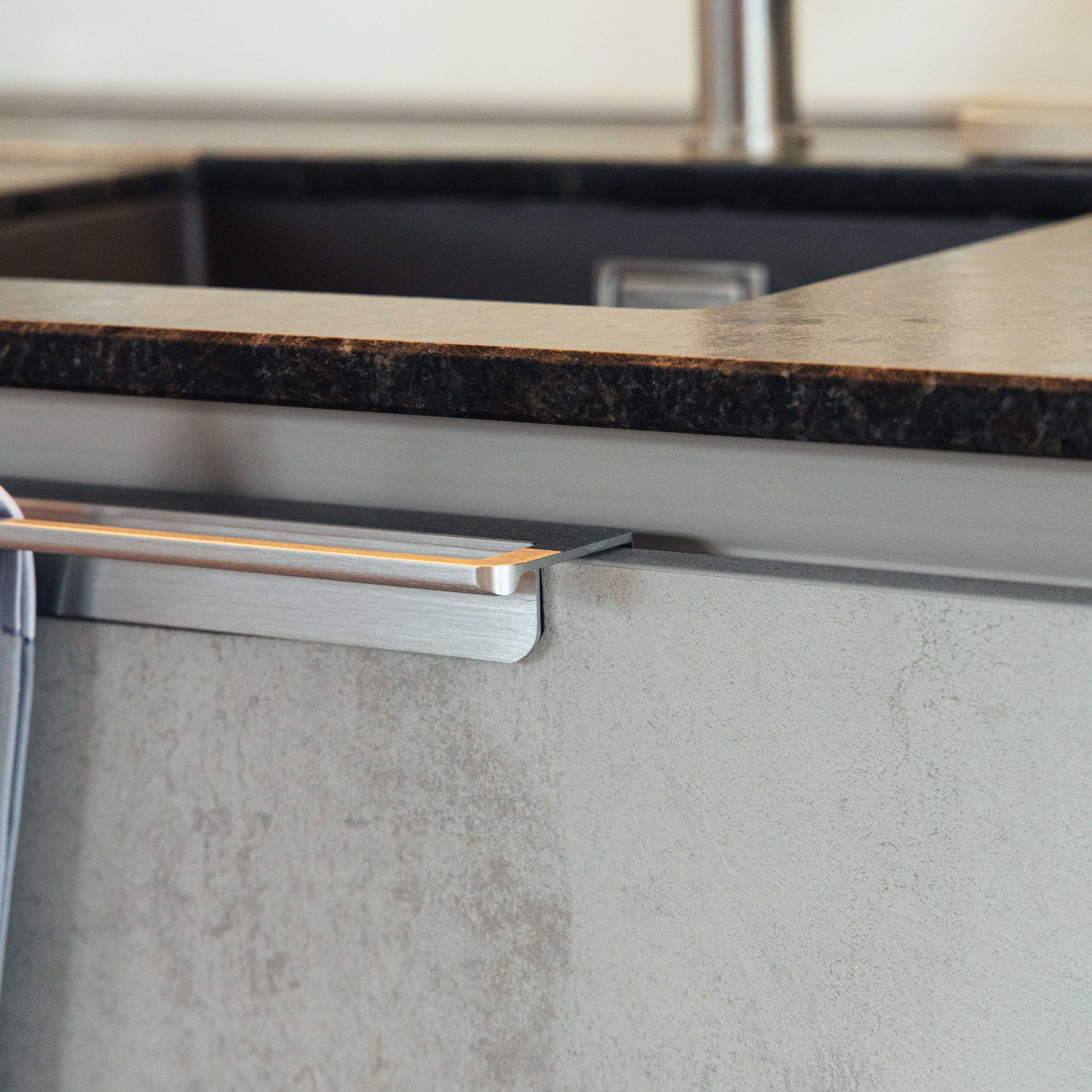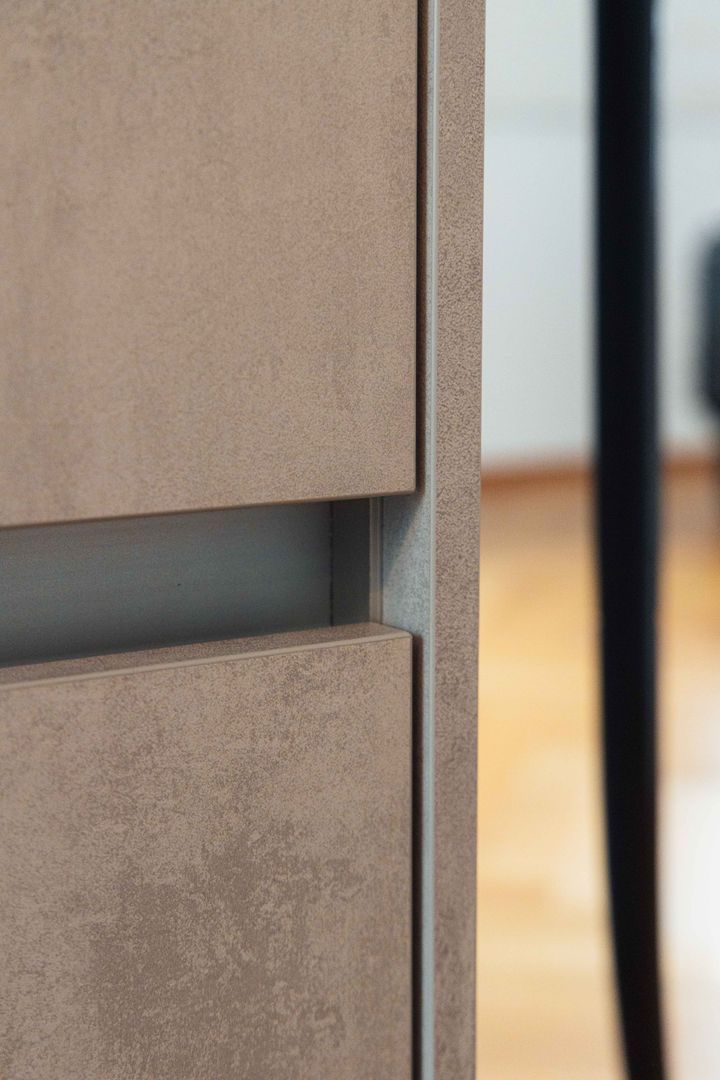 Diese zeitlose und funktionale Küche von Schüller Küchen in Beton-Quarzgrau mit weißer Glasrückwand und Eselstahl-Griffleisten haben wir für eine Kundin in Mondsee realisiert.
