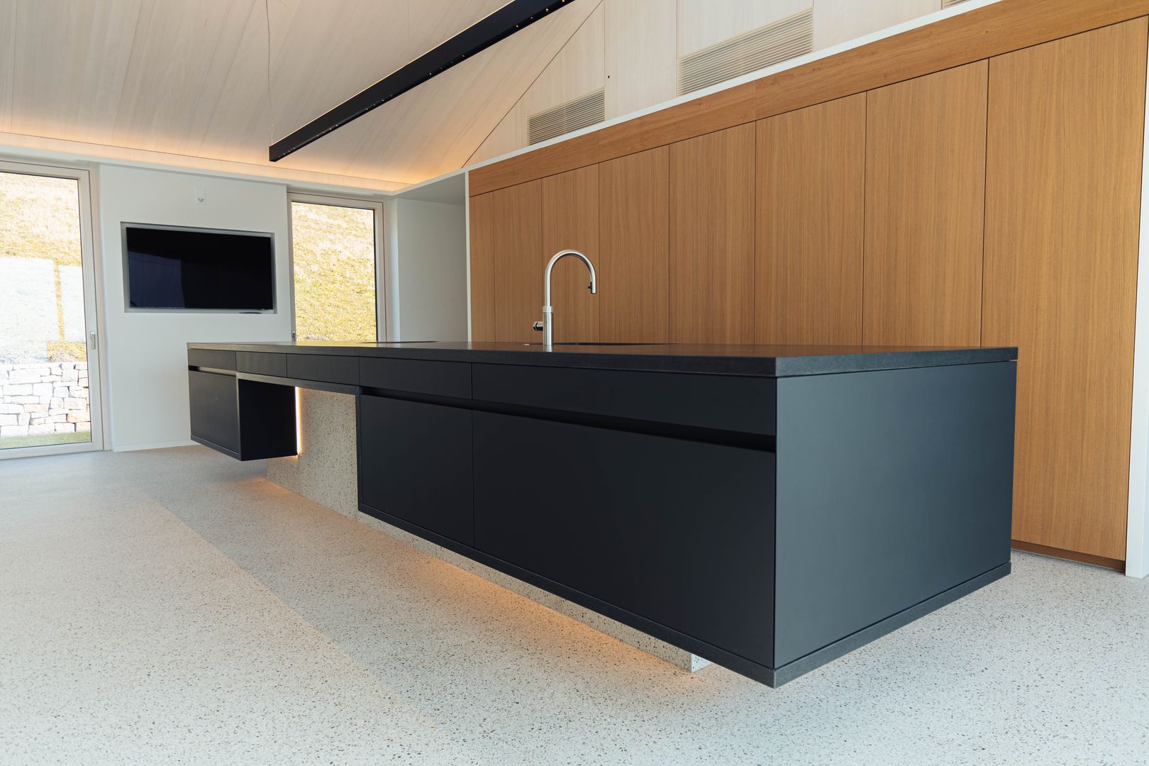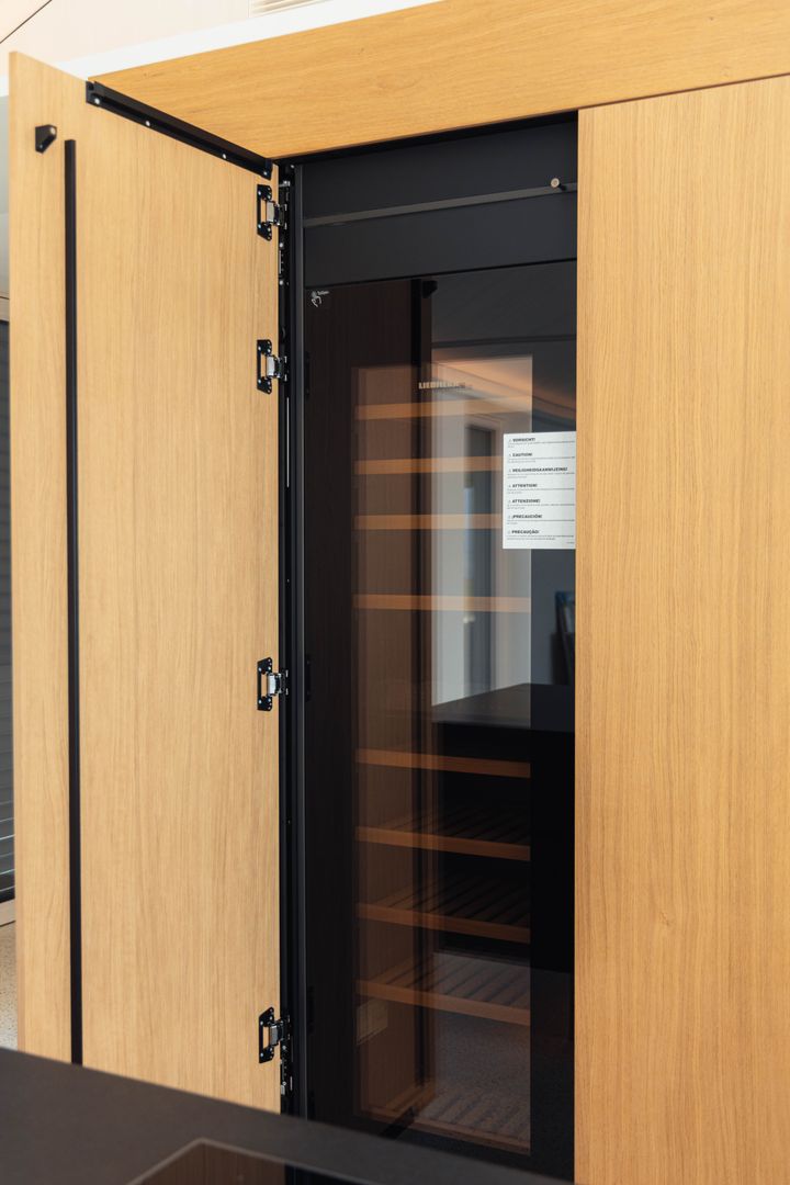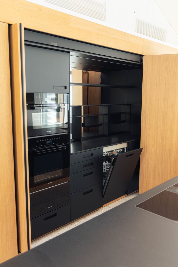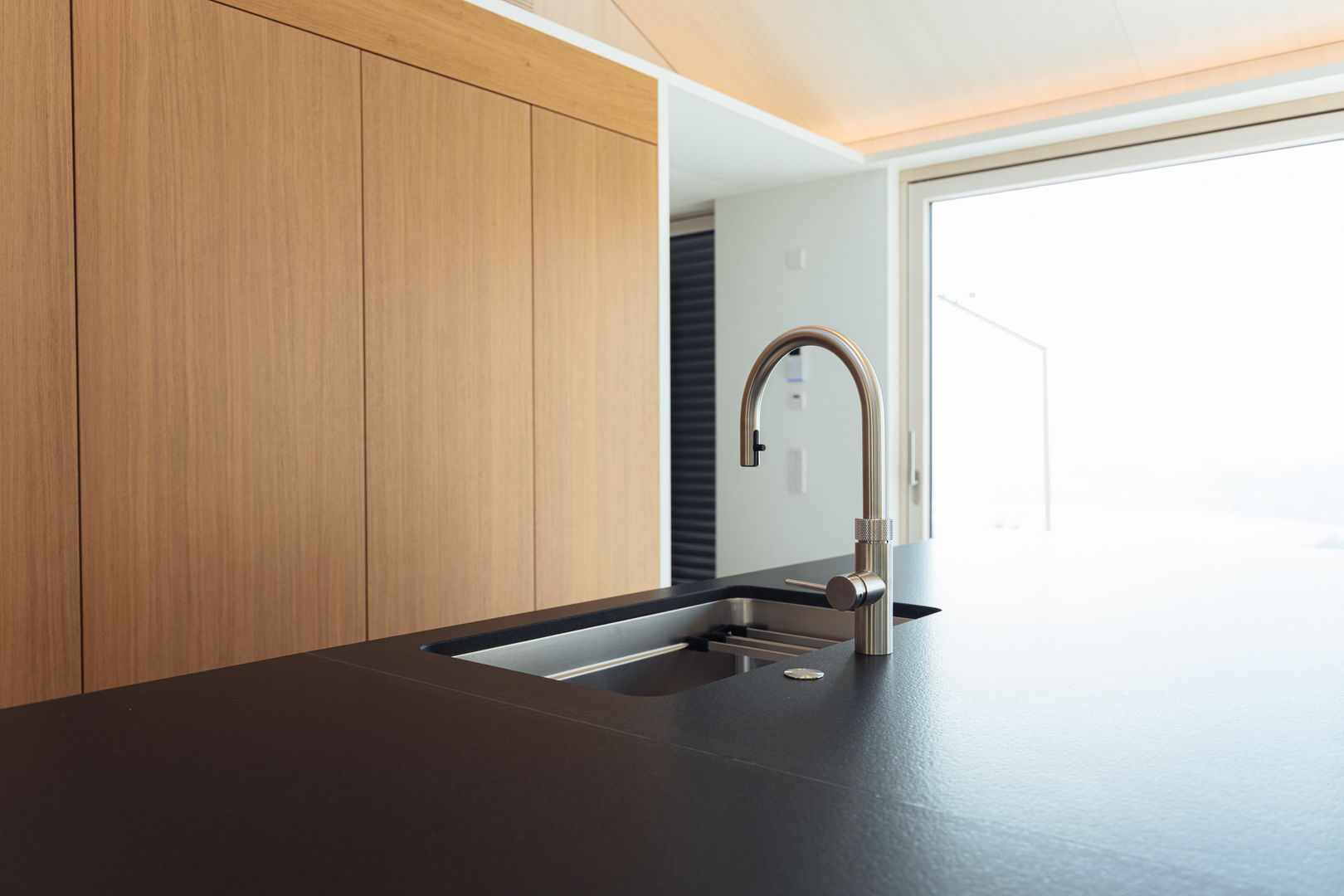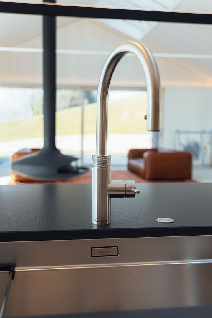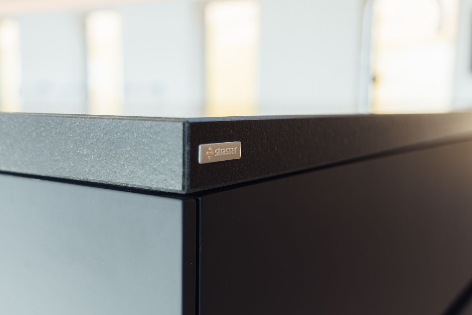Extravagant präsentiert sich diese außergewöhnliche next125 Küche mit Kochinsel. Die Insel mit lavaschwarzen Fronten und STRASSER Steinarbeitsplatte Nero Assoluto im Leather Look wurde auf einen Steinsockel aufgesetzt. Sie ist indirekt beleuchtet und steht im Kontrast zu den Hochschränken mit Pocketsystem in Eiche elegant bianco hell. Ein Teil der Fronten kann eingeschoben werden und ermöglichen so uneingeschänktes Arbeiten mit dem hochgestellten Backofen und Dampfgarer sowie dem Geschirrspüler von Miele. Hinter den Fronten mit Knock-to-open-Funktion verbergen sich der Kühlschrank und Gefrierschrank von Liebherr. Ein Weinklimaschrank von Liebherr sowie das flächenbündige Flächeninduktionskochfeld Bora Professional 3.0 komplettiert die Küchengeräte. Die Unterbauspüle Blanco Etagon sowie der Quooker Flex in Edelstahl fügen sich nahtlos in das Bild ein.