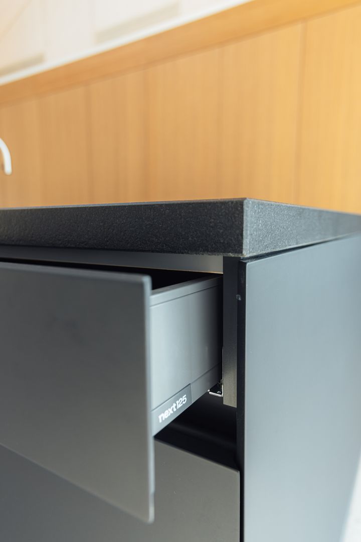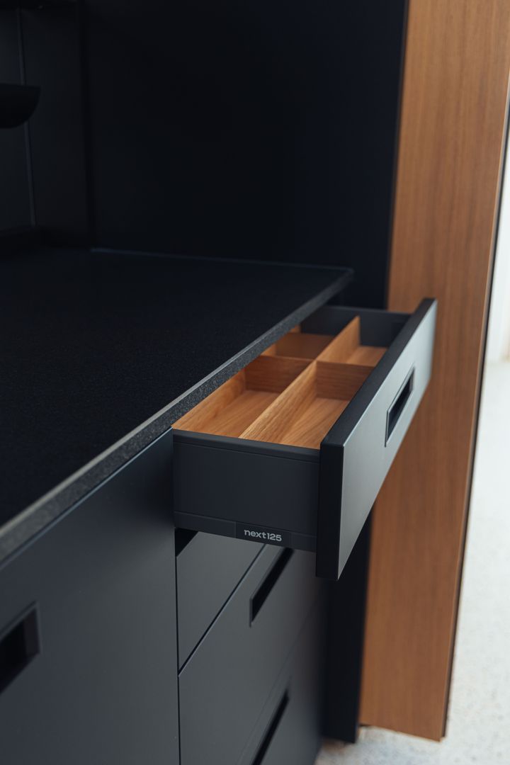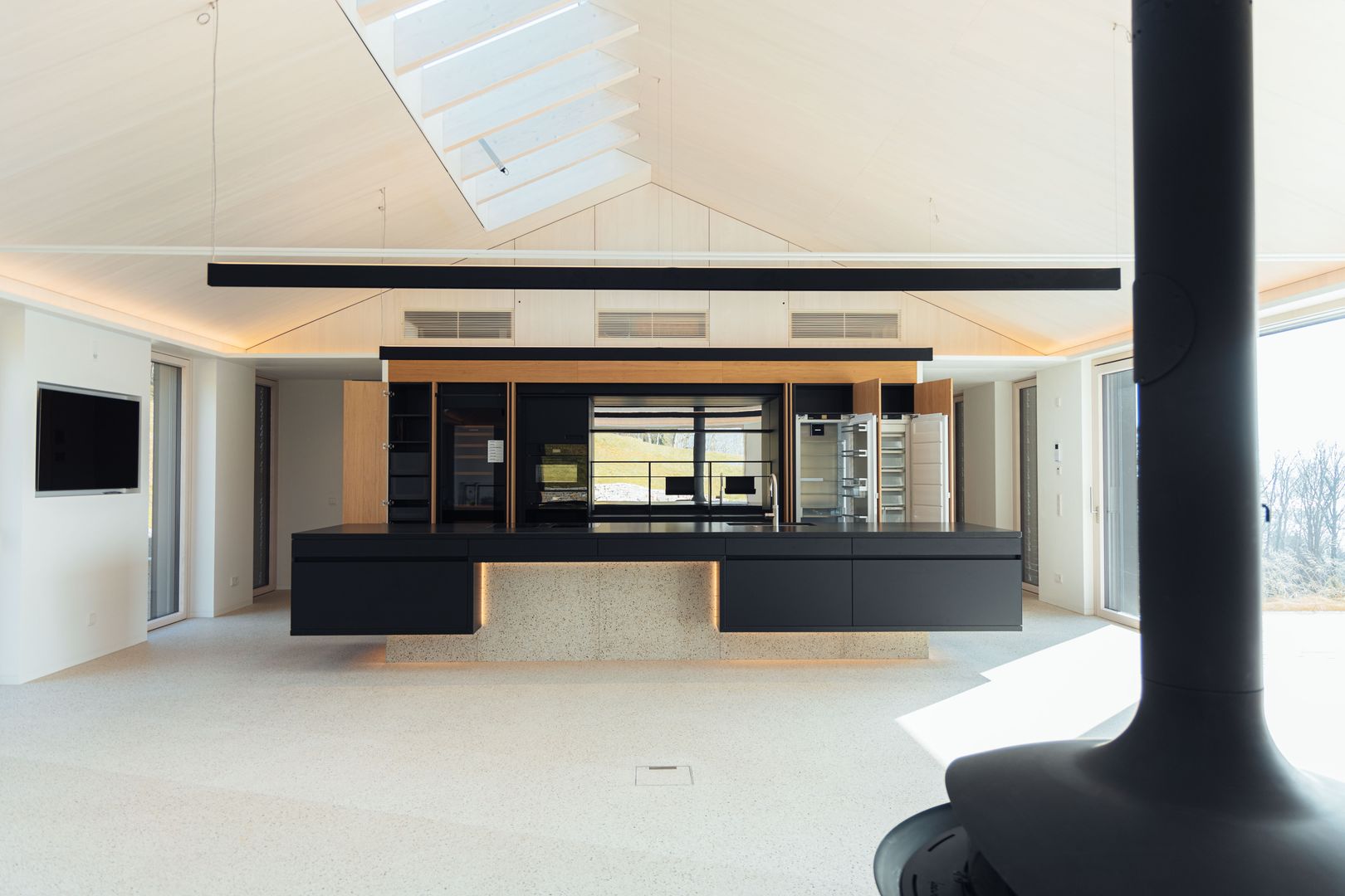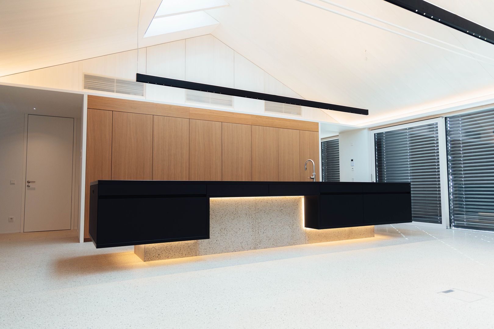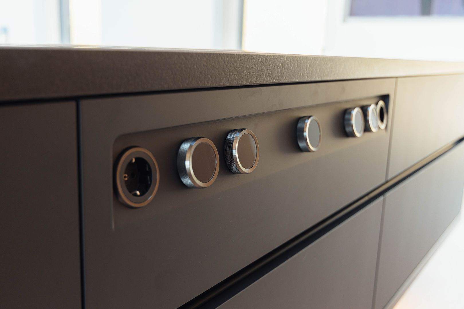 Extravagant präsentiert sich diese außergewöhnliche next125 Küche mit Kochinsel. Die Insel mit lavaschwarzen Fronten und STRASSER Steinarbeitsplatte Nero Assoluto im Leather Look wurde auf einen Steinsockel aufgesetzt. Sie ist indirekt beleuchtet und steht im Kontrast zu den Hochschränken mit Pocketsystem in Eiche elegant bianco hell. Ein Teil der Fronten kann eingeschoben werden und ermöglichen so uneingeschänktes Arbeiten mit dem hochgestellten Backofen und Dampfgarer sowie dem Geschirrspüler von Miele. Hinter den Fronten mit Knock-to-open-Funktion verbergen sich der Kühlschrank und Gefrierschrank von Liebherr. Ein Weinklimaschrank von Liebherr sowie das flächenbündige Flächeninduktionskochfeld Bora Professional 3.0 komplettiert die Küchengeräte. Die Unterbauspüle Blanco Etagon sowie der Quooker Flex in Edelstahl fügen sich nahtlos in das Bild ein.