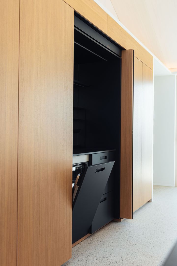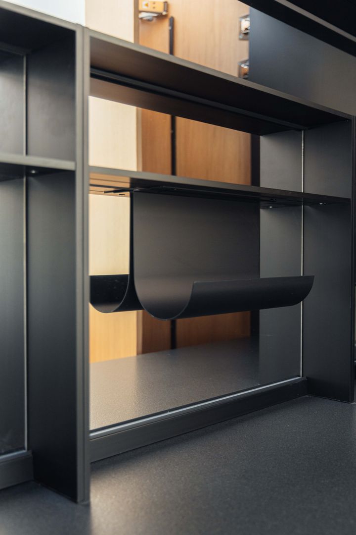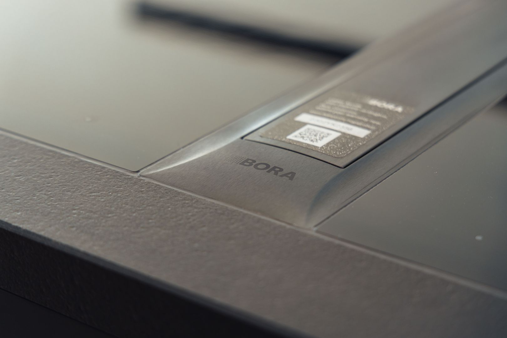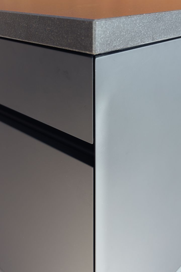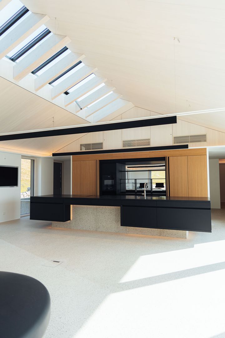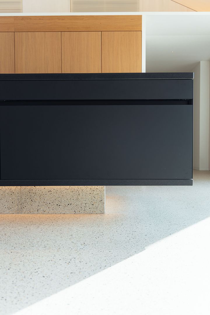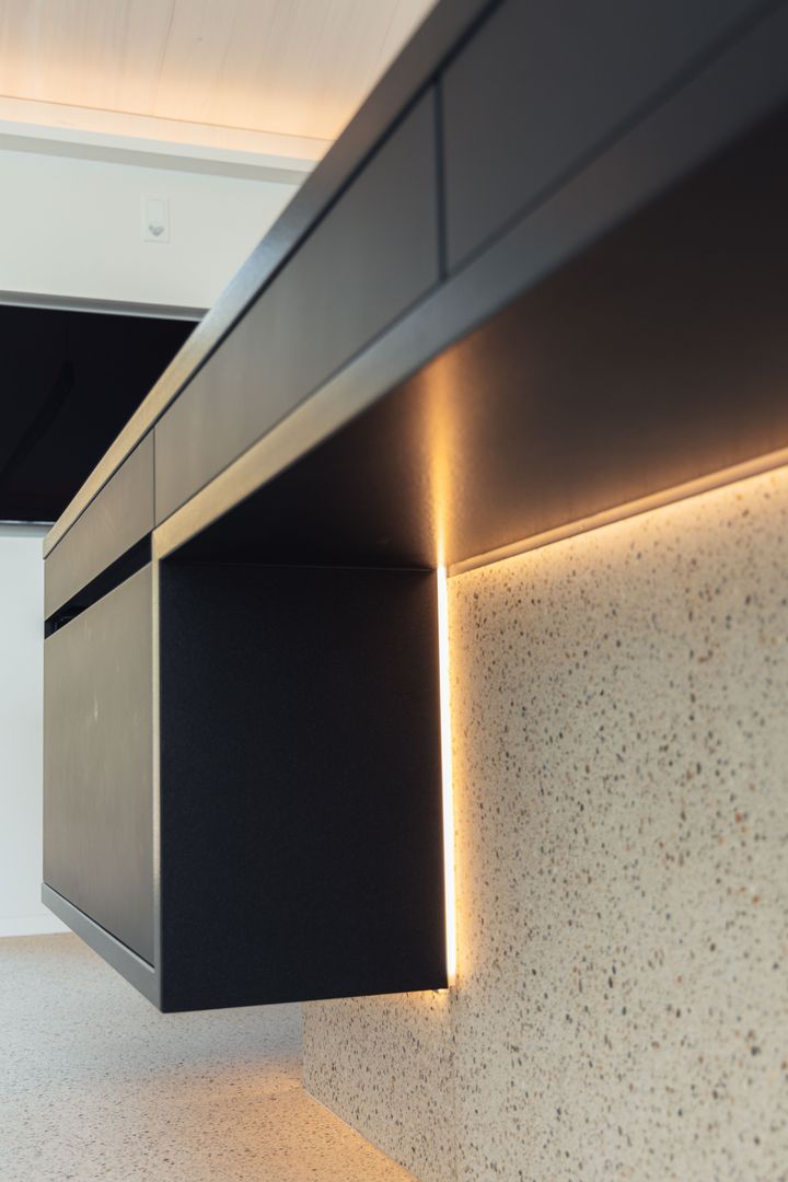 Extravagant präsentiert sich diese außergewöhnliche next125 Küche mit Kochinsel. Die Insel mit lavaschwarzen Fronten und STRASSER Steinarbeitsplatte Nero Assoluto im Leather Look wurde auf einen Steinsockel aufgesetzt. Sie ist indirekt beleuchtet und steht im Kontrast zu den Hochschränken mit Pocketsystem in Eiche elegant bianco hell. Ein Teil der Fronten kann eingeschoben werden und ermöglichen so uneingeschänktes Arbeiten mit dem hochgestellten Backofen und Dampfgarer sowie dem Geschirrspüler von Miele. Hinter den Fronten mit Knock-to-open-Funktion verbergen sich der Kühlschrank und Gefrierschrank von Liebherr. Ein Weinklimaschrank von Liebherr sowie das flächenbündige Flächeninduktionskochfeld Bora Professional 3.0 komplettiert die Küchengeräte. Die Unterbauspüle Blanco Etagon sowie der Quooker Flex in Edelstahl fügen sich nahtlos in das Bild ein.