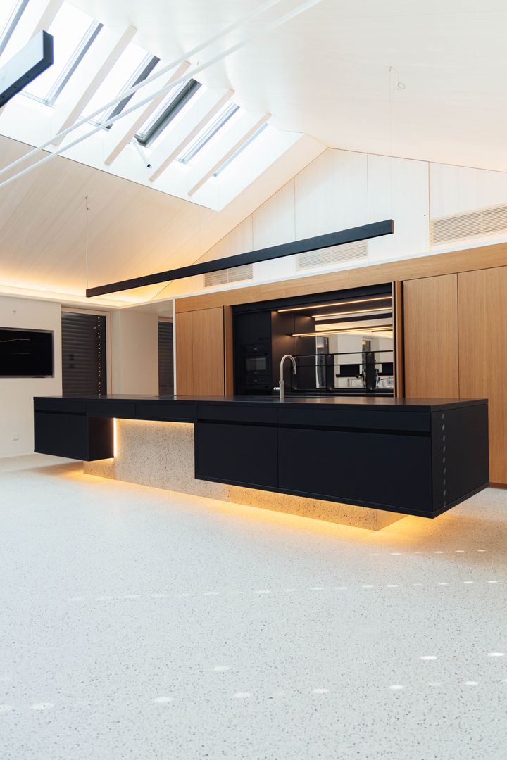 Extravaganter Küchentraum mit Insel auf Steinsockel