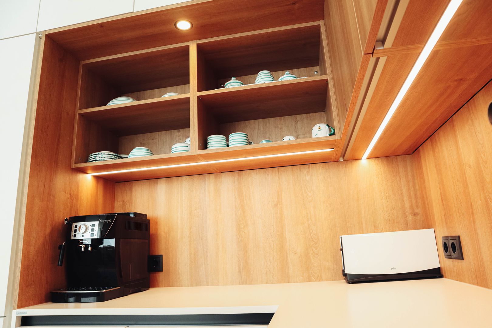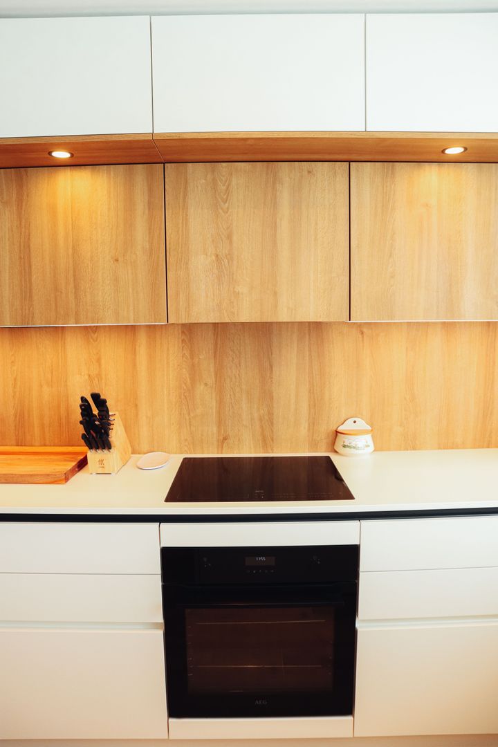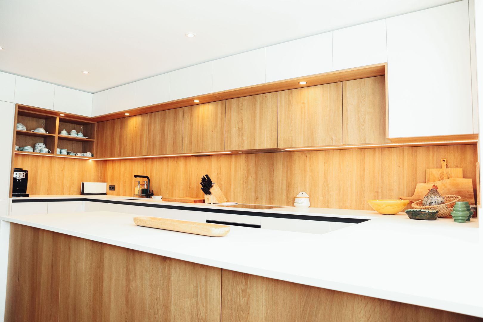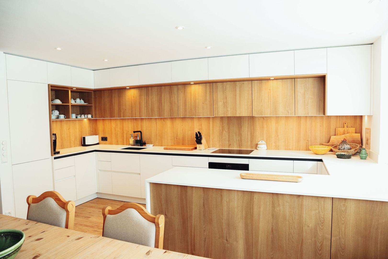 Diese Küche von Schüller kombiniert Fronten in Weiß matt mit Fronten in Aurora Eiche Nachbildung. Die Oberschränke wurden mit Spots und LED-Schienen versehen. Auf Kundenwunsch haben wir einen Teil der Steckdosen in die Unterseite der Oberschränke eingefräst. Lavaschwarz matte Griffmulden sowie die Armatur und Unterbauspüle von Blanco in Schwarz sorgen für Kontraste. Die Keramikarbeitsplatte Ice ist vom Mühlviertler Qualitätsbetrieb Strasser Steine. Hochwertige Geräte von Miele, AEG und Liebherr komplettieren die Küche.
