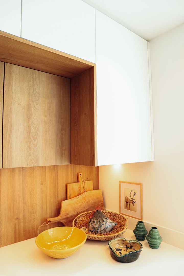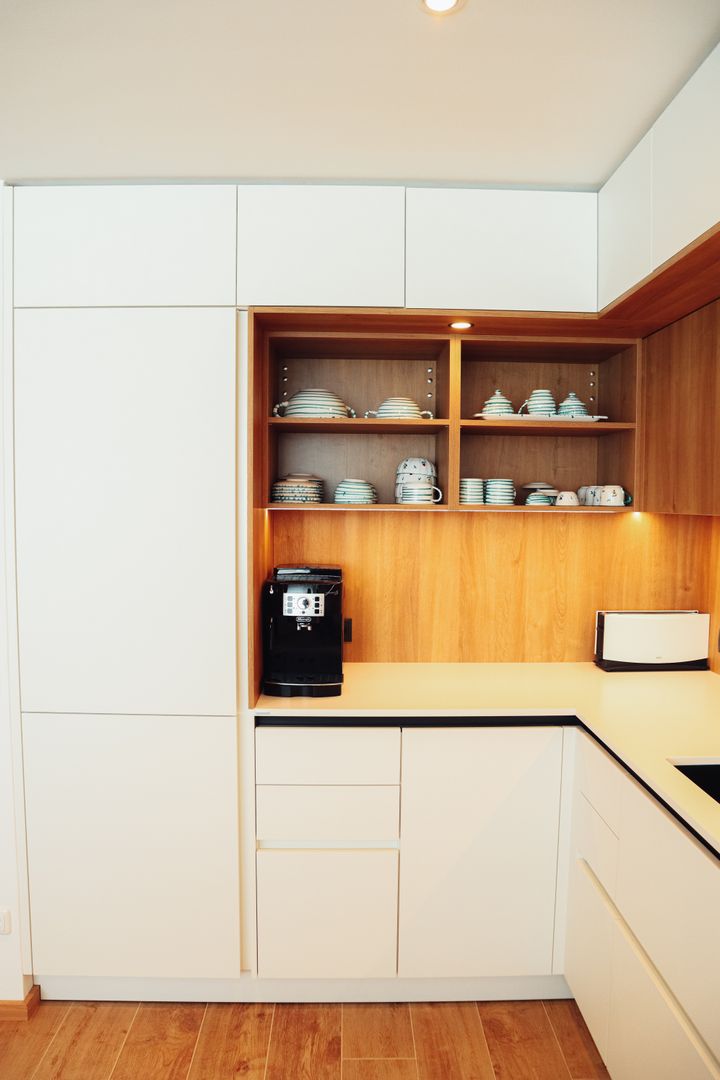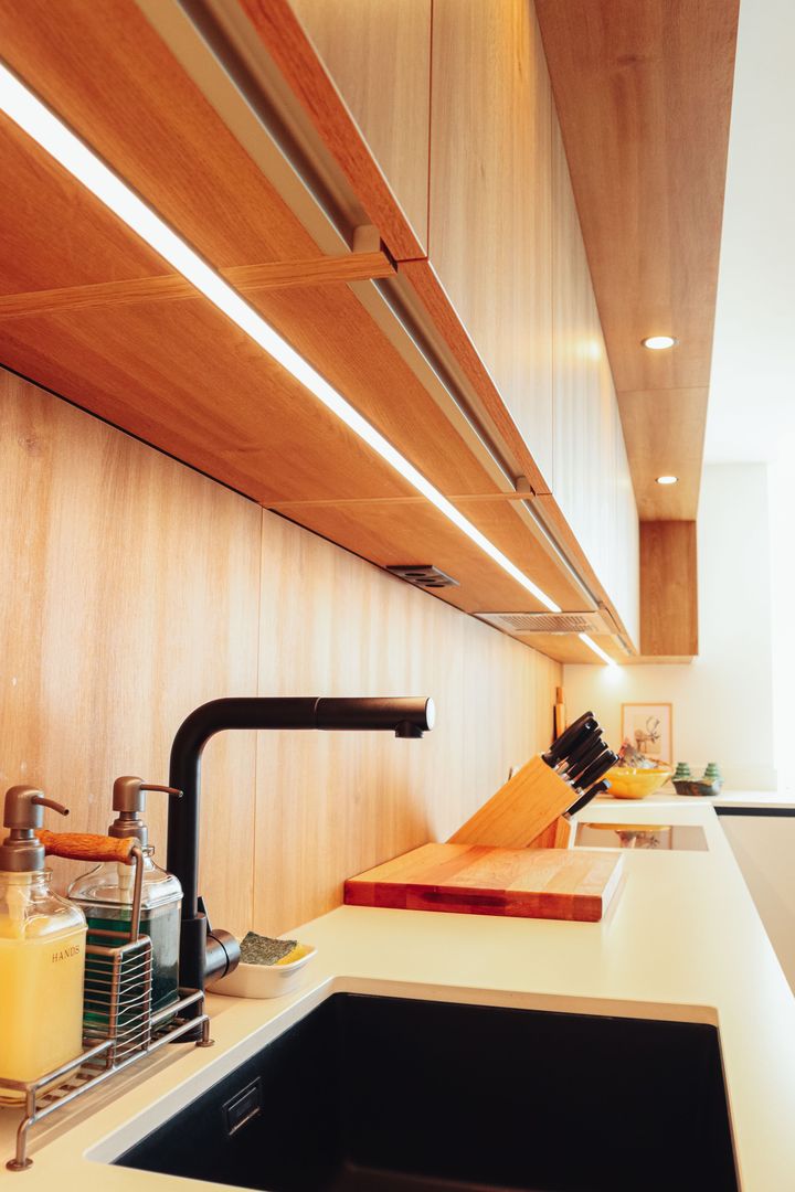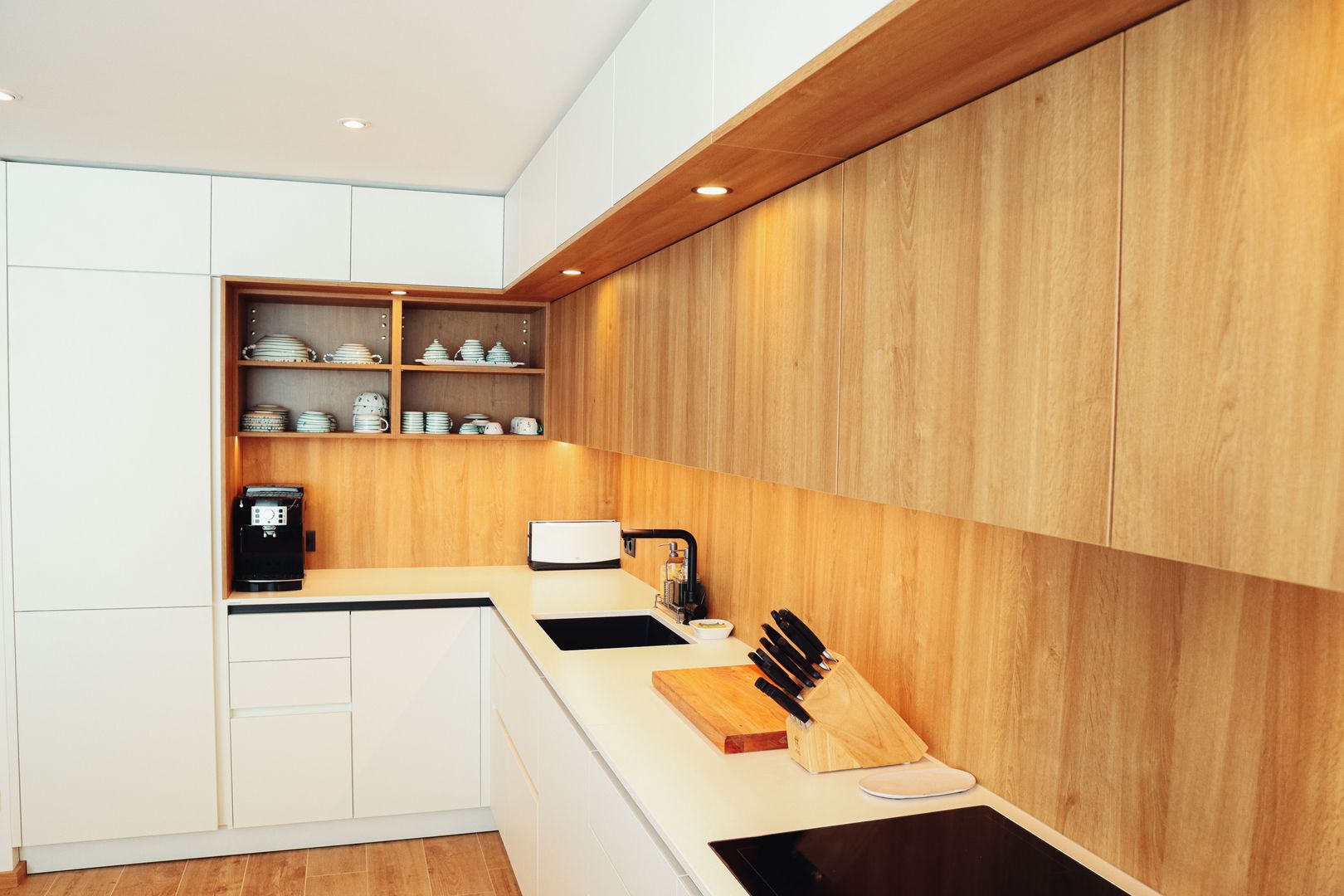 Diese Küche von Schüller kombiniert Fronten in Weiß matt mit Fronten in Aurora Eiche Nachbildung. Die Oberschränke wurden mit Spots und LED-Schienen versehen. Auf Kundenwunsch haben wir einen Teil der Steckdosen in die Unterseite der Oberschränke eingefräst. Lavaschwarz matte Griffmulden sowie die Armatur und Unterbauspüle von Blanco in Schwarz sorgen für Kontraste. Die Keramikarbeitsplatte Ice ist vom Mühlviertler Qualitätsbetrieb Strasser Steine. Hochwertige Geräte von Miele, AEG und Liebherr komplettieren die Küche.