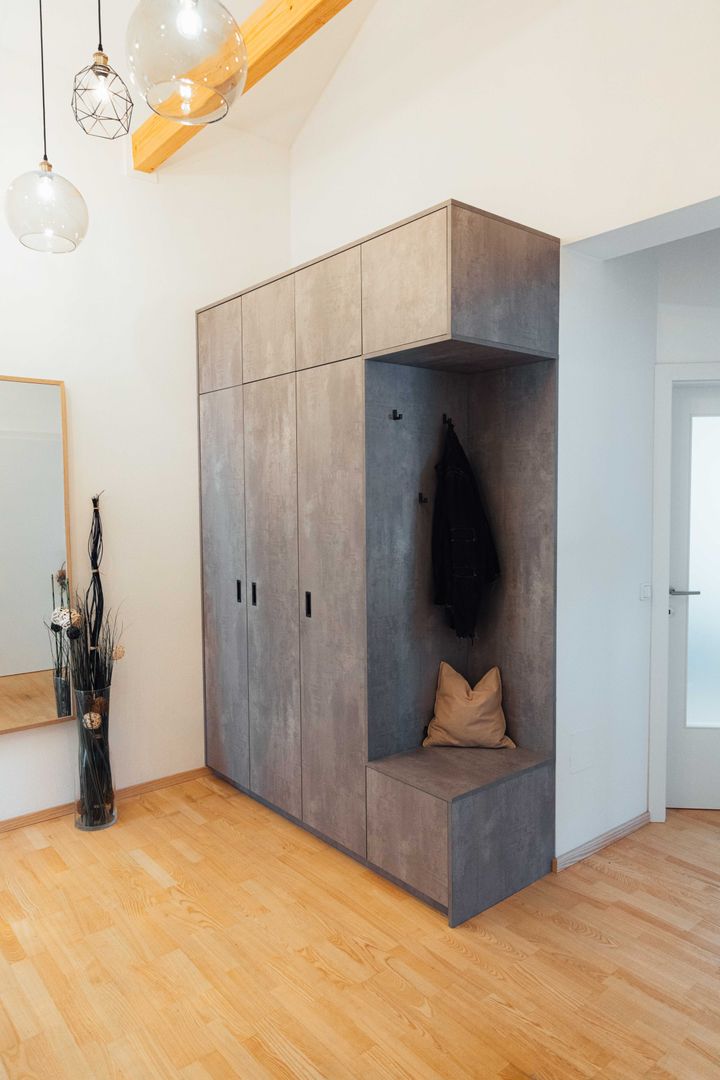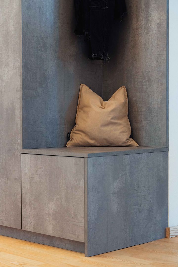 - Schrank in Betonoptik mit integrierter Garderobe und Sitzmöglichkeit